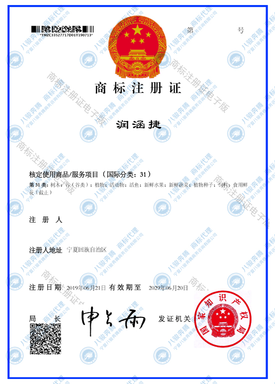 商標(biāo)簡(jiǎn)介:潤(rùn)涵捷包括第5(枸杞、藥品、藥茶藥酒等)、29(肉類制品和糧油加工食品)、30(茶、糖、米、面等主食及其加工副產(chǎn)品)、31(新鮮果蔬、苗木、種子、養(yǎng)殖、水產(chǎn)等農(nóng)副產(chǎn)品) 、33(酒類飲料)、35(商務(wù)服務(wù)、市場(chǎng)營(yíng)銷、廣告)等六類,是從事農(nóng)業(yè)相關(guān)行業(yè)不可多得的好商標(biāo)!