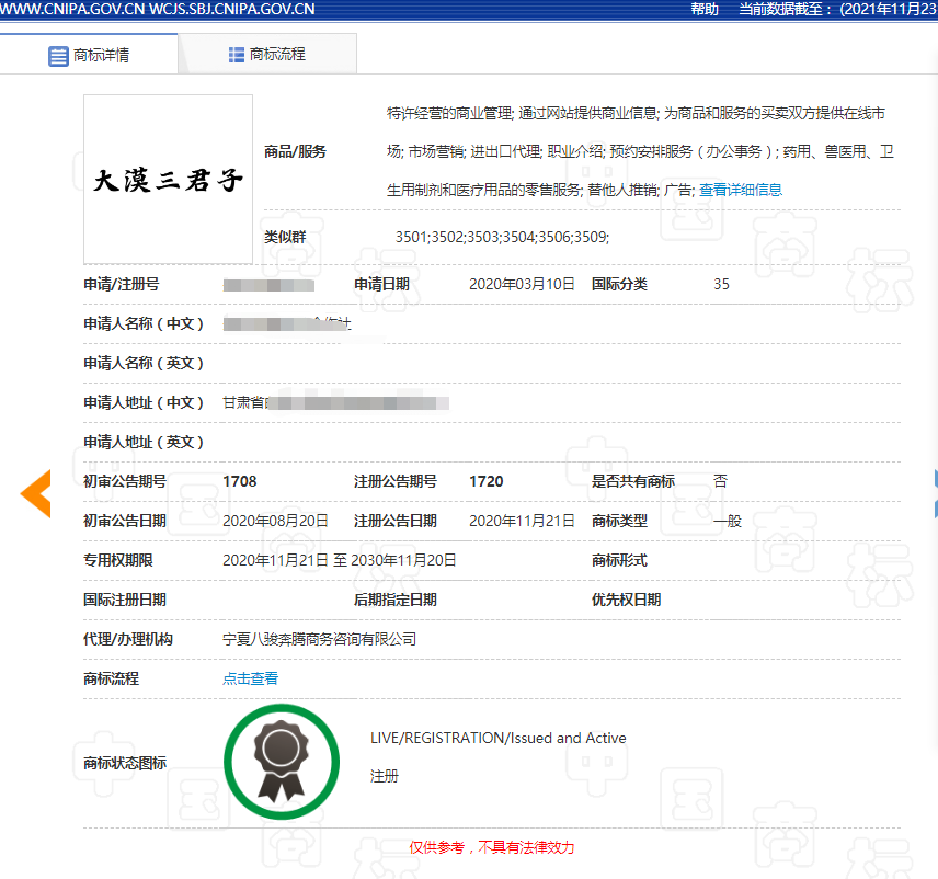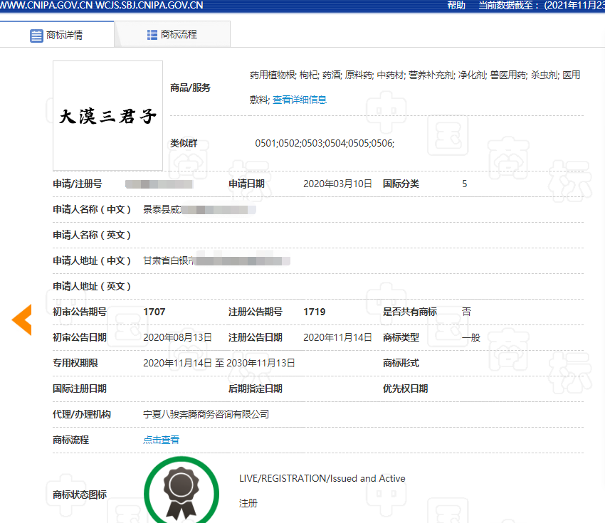 商標簡介: 05—— 藥用植物根; 枸杞; 藥酒; 原料藥; 中藥材; 營養(yǎng)補充劑; 凈化劑; 獸醫(yī)用藥; 殺蟲劑; 醫(yī)用敷料;